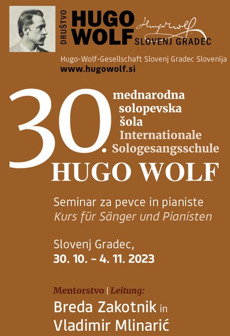 Med 30. oktobrom in 4. novembrom 2023 bo v Rojstni hiši Huga Wolfa potekala 30. mednarodna solopevska šola Hugo Wolf, seminar za pevce in pianiste pod mentorstvom Brede Zakotnik in Vladimirja Mlinarića. Prijavnica: